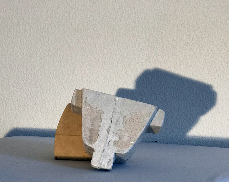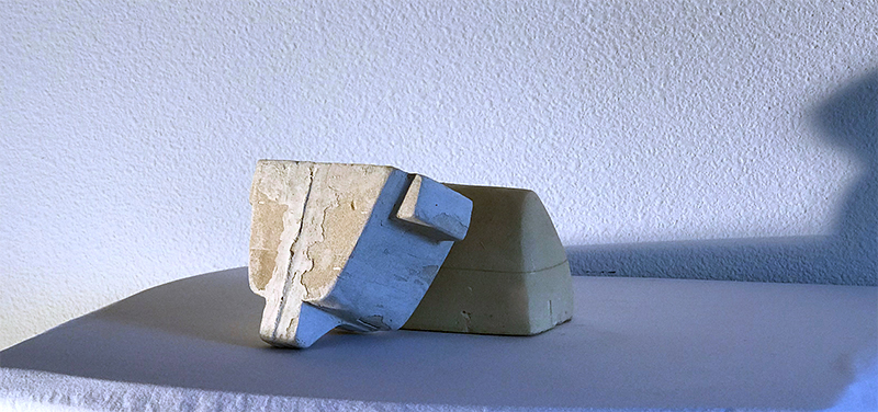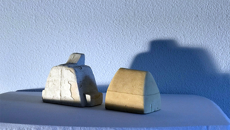 These are foam molds that were shaped and rendered with Exacto blades, steel wire, and dental cleaning tools. A two-dimensional outline is printed and glued on a foam block, and consequently, a three-dimensional shape is carved out of this. Various iterations can occur before a perfect mold is produced because even the slightest mistake will render a mold useless. Corners and angles are particularly difficult to shape. You can use different grade sandpaper to gradually define the surface and texture of the mold. Once the mold is ready it is housed in a wooden box made with individual planks and sealed with clay. Ultimately plaster is prepared and poured into the mold box and left to cure overnight. The end result is a plaster mold negative that can serve to pour ceramics.